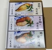 <金目鯛の酒香焼・銀鱈の西京焼・鰆の醤油麹焼>